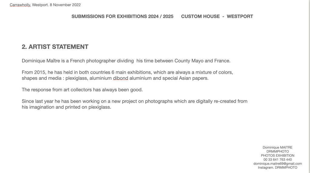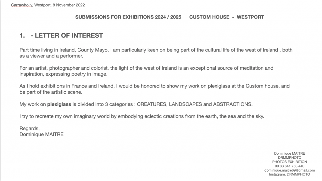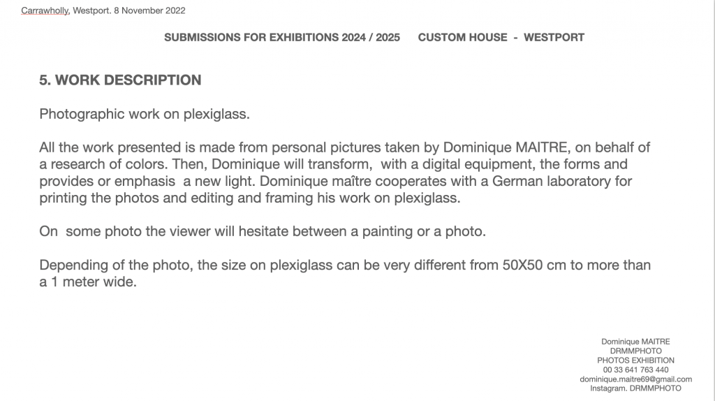 C’est en Irlande et en France que l’artiste a fait 6 expositions depuis 2015, interrompues pendant la période du covid. Toujours dans la même démarche créative, Dominique Maître s’est attaché à utiliser différents supports (aluminium/dibon, papiers spéciaux du Népal, plexiglass) permettant d’exprimer au mieux la lumière.