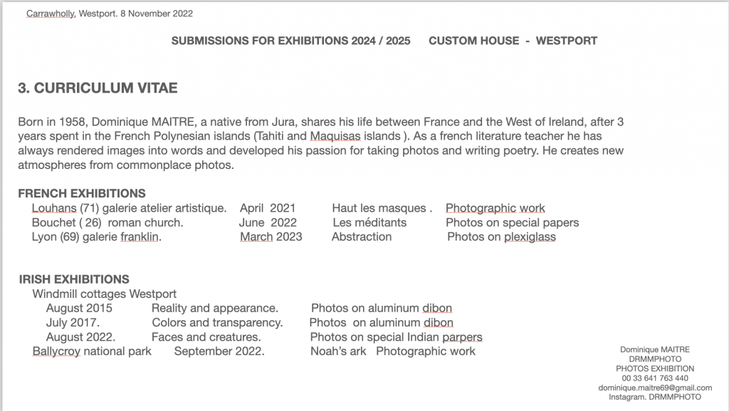 Né en 1958, Dominique MAITRE, d’origine jurassienne, partage sa vie entre Lyon et la côte ouest de l’Irlande après avoir vécu 3 années dans les îles Marquises (Polynésie). Fortement sensibilisé par les jeux de lumière, de transparence et de couleur dans ces lieux extrêmes, il a toujours exprimé le besoin d’écrire des images. Professeur de Lettres, il a développé en parallèle sa passion pour la photographie et la poésie.